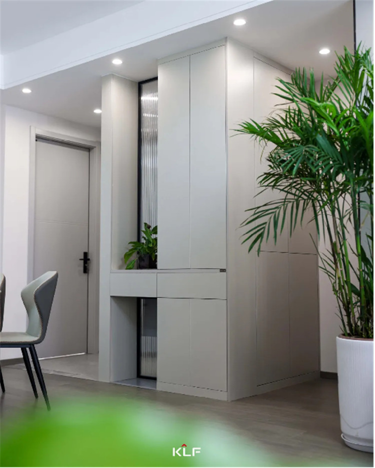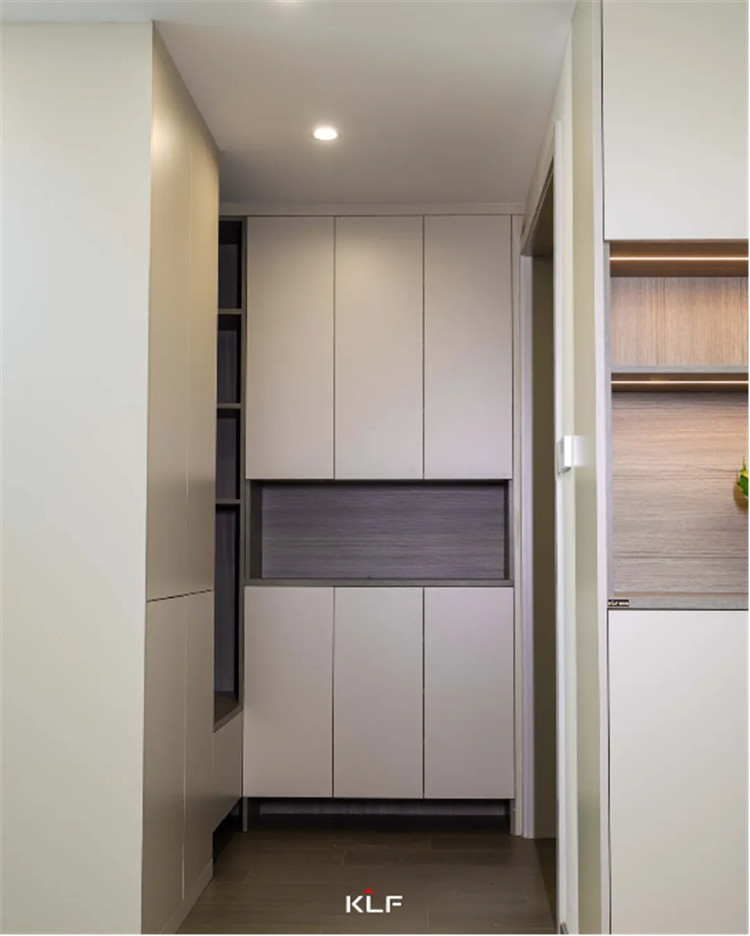入户的玄关走廊处做上了到顶的鞋柜,鞋柜的底部留空加上藏光,在鞋柜傍边还留了开放储物地区,日常平凡利用很是便利。