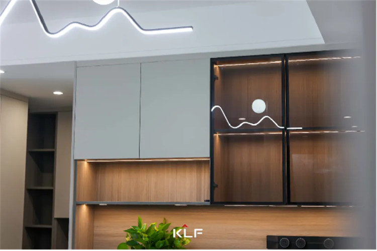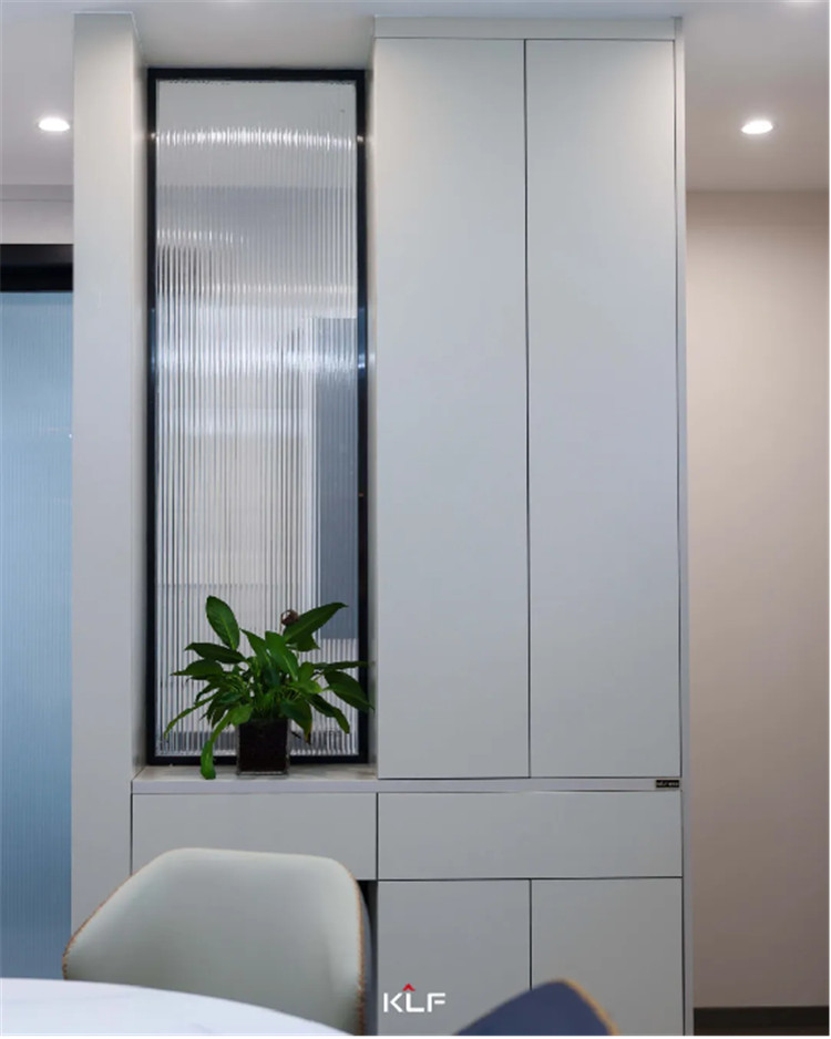 在餐厅与洗手间的地区间以一组隔绝距离柜去停止空间丑化,交叉的设想手段以抽屉分开全部高柜,全体尺寸加倍调和,中部插手长虹玻璃的设想能够搭配绿植或是手办摆件,全体会更精美。