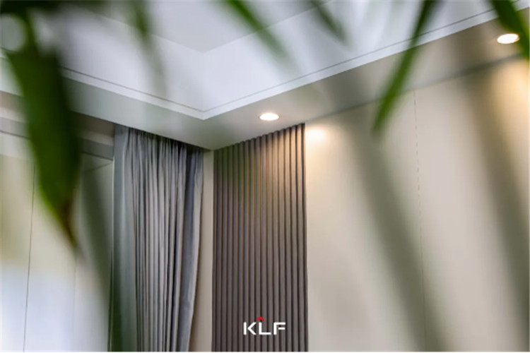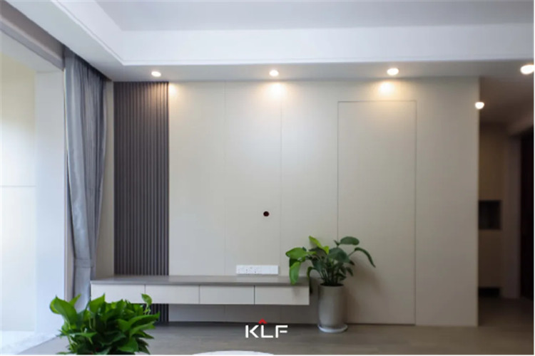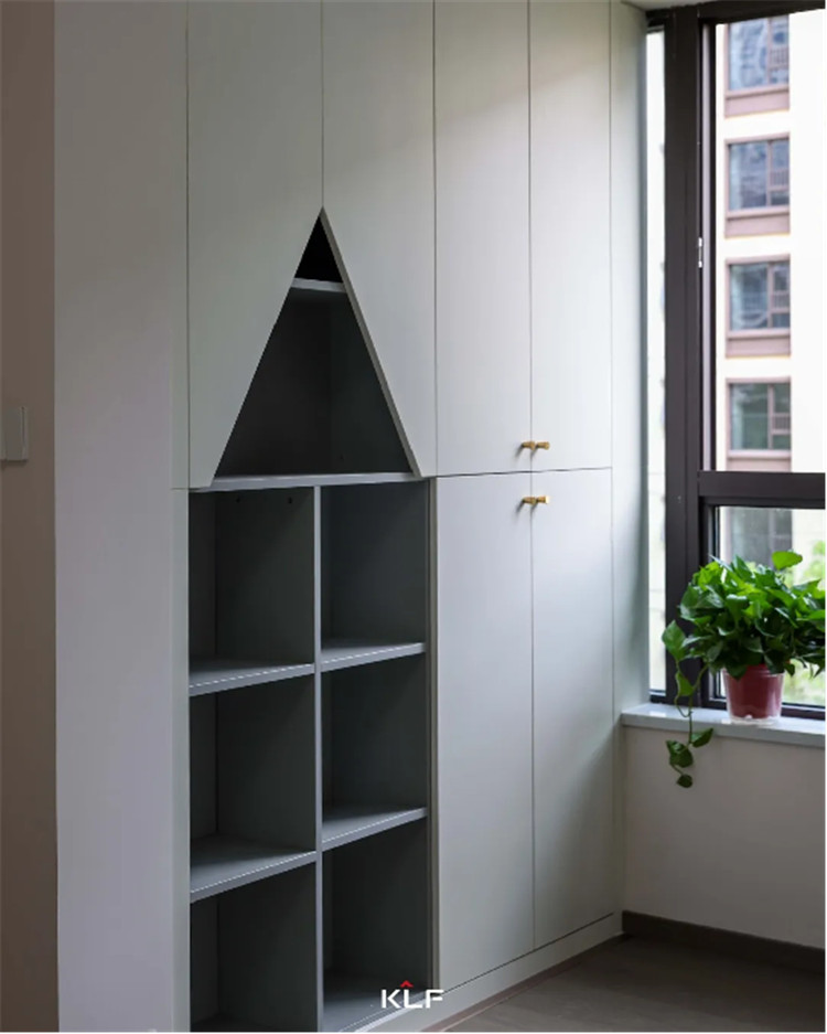 电视柜一侧做了隐形门,让屋内的儿童房加倍隔音,更具私密性。墙板一侧做了格栅,偶尔的跳脱丰硕了全体的设想,门墙柜一体化的设想也从视觉上让空间看起来更清洁,显大又高等。