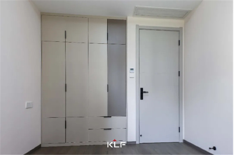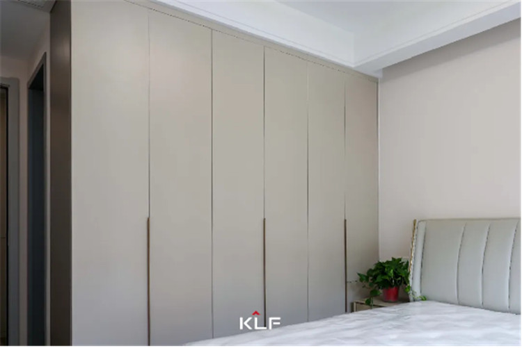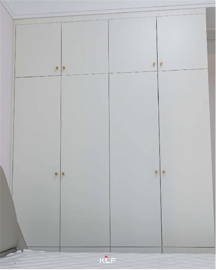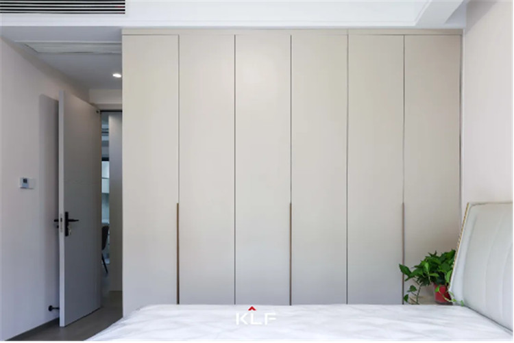 主寝室作为屋主的歇息区,全体更夸大收纳性和温馨度,接纳茶白的色采与全屋红色系更适配,一门到顶的整排衣柜接纳的是一字型通体拉手,便利利用。