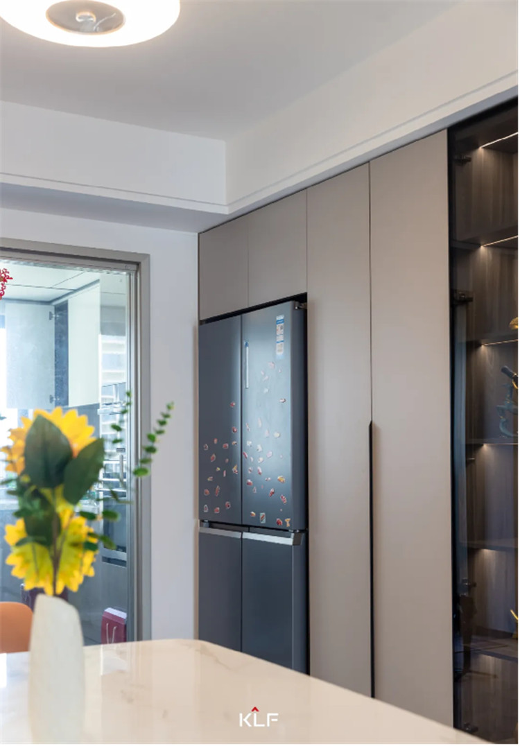 在落地式的厨房收纳桌上我们一起以留白手法让整面墙更有正常呼吸感,而新材料技术红木纹的背板也让“木石取得联系”带去更丰盈的空間视觉质感。