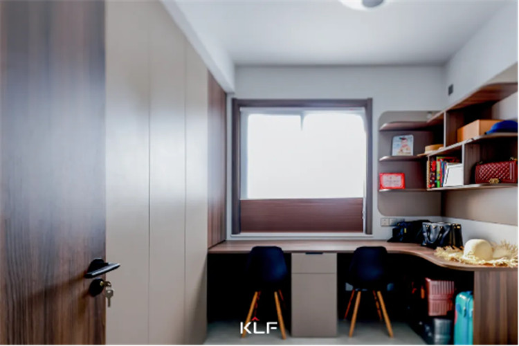 卧室定制衣柜使用放入式定制衣柜平开门工作设想,整排到顶定制衣柜保驾护航了百口人的收纳空间要有,靠窗而置的写字台可一并容忍2人的进修申请与办公场所。