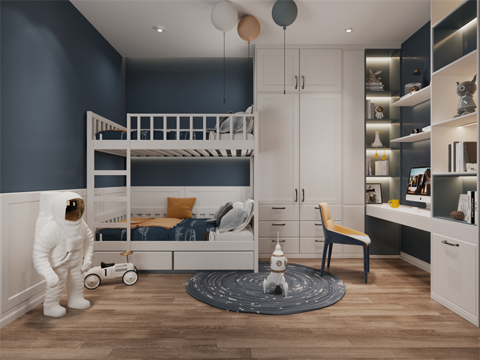小孩子房区域空间拉长了构想的⾊彩内容,不同饱和度的淡蓝色一同艰深的浩瀚星空蓝,沉积并长满思虑,L形的建议也被欢乐支配。