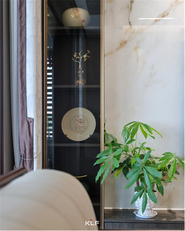 云飞马鸣,着花落叶,事事相干,物物相连。全部客堂以深色为主调,空间部分小品和绿植讲求节拍感与韵律美,与全体气概构成类比,凸显空间的条理感与次序性。