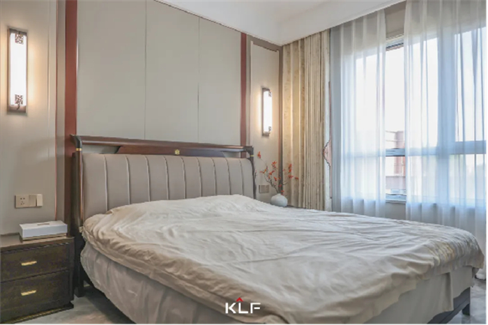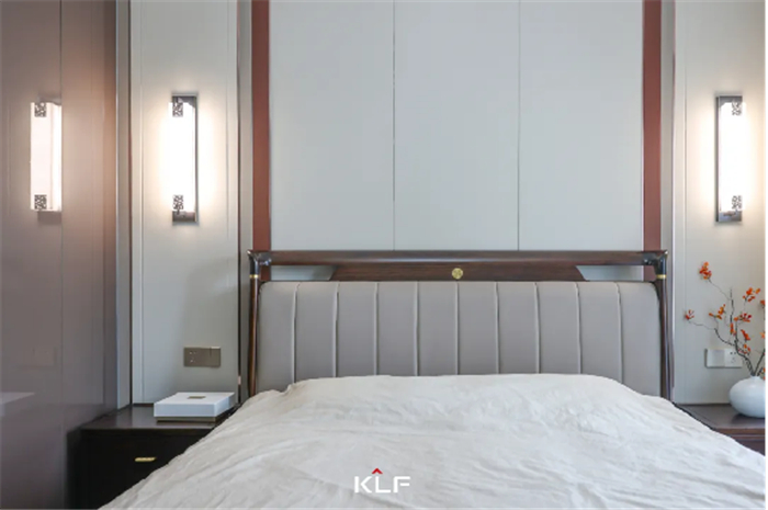 新中式床头背景墙,勾画出一个安好遥远的意境,搭配色采浓艳的复旧灯具,方寸之间皆是大雅神韵。